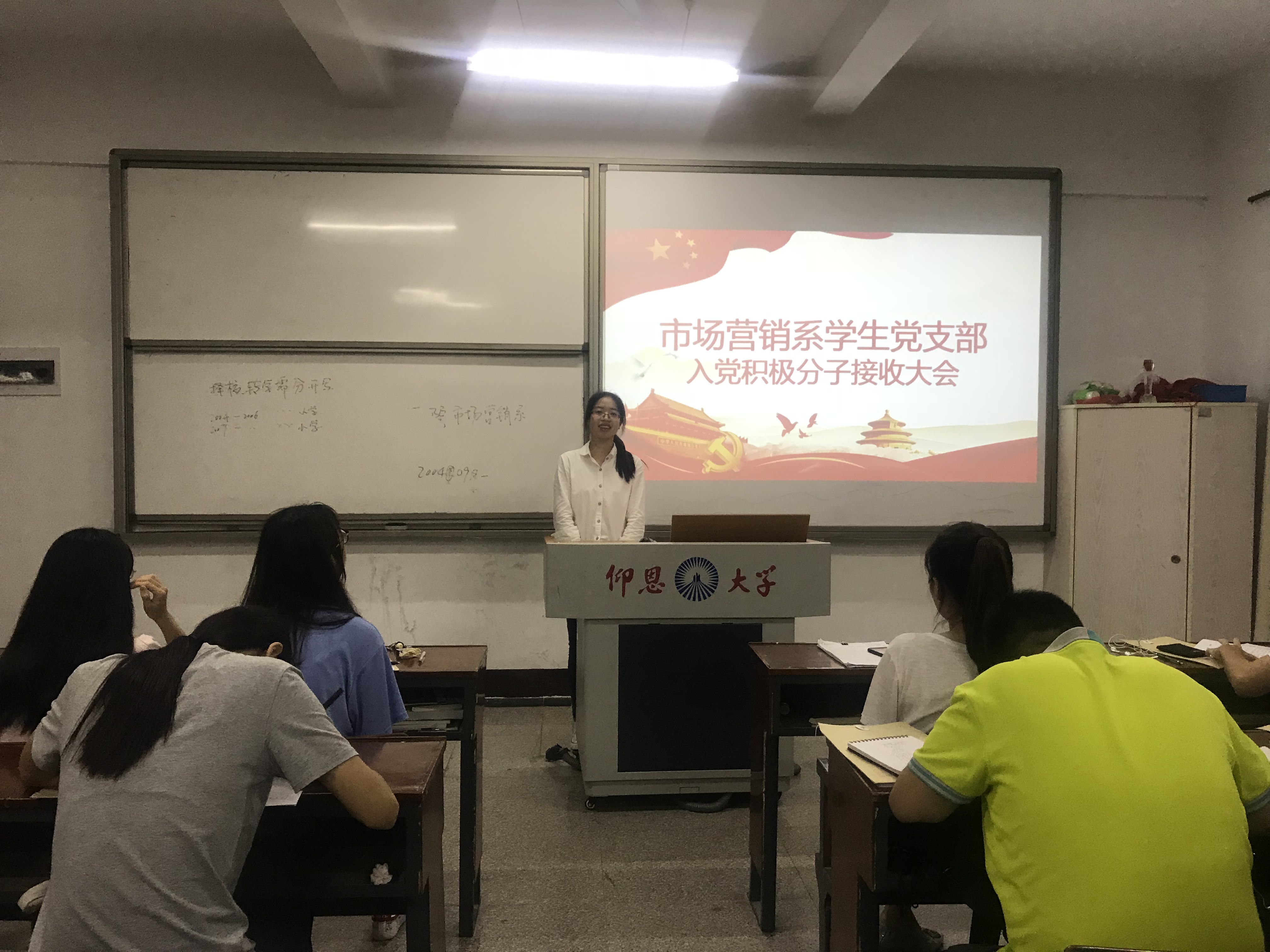(积极分子发言) 此次入党积极分子接收大会的召开,不仅为市场营销系学生党支部注入了新的血液,也大大的提高了同学们的积极性,促使同学们在未来的学习生活中更加严格要求自己,做好模范带头作用。(文/林锦怡 图/马雪婷)