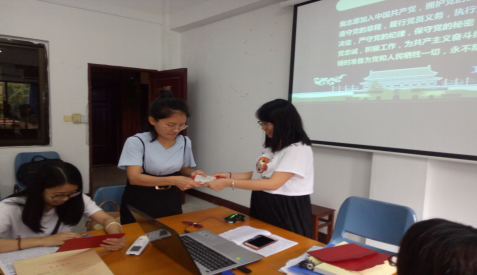 大会从支部书记蔡惠丽老师给每位党员发放“政治生日”贺卡拉开帷幕,贺卡上明确写上了中国共产党入党誓词,让每位收到贺卡的党员同志能够重温一次入党誓词,帮助其回忆党组织的培养历程,从而强化了党员宗旨意识,切实增强了党员的荣誉感、责任感、使命感。随后,带领大家学习了入党誓词的变迁,强调每位毕业生党员在今后日常的工作中,时刻不忘自己是一名共产党员,要牢记党的宗旨、增强党员意识、坚定党的信念、忠诚党的事业,永葆共产党员的先进本色。