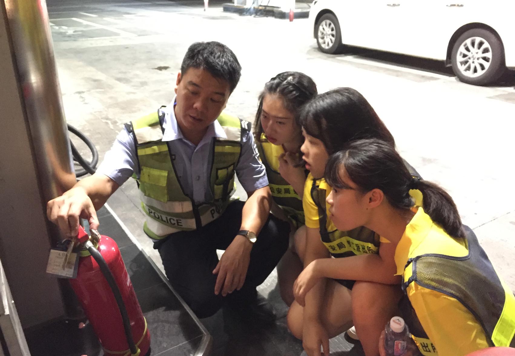 警官为实践队员讲授灭火器的使用方法