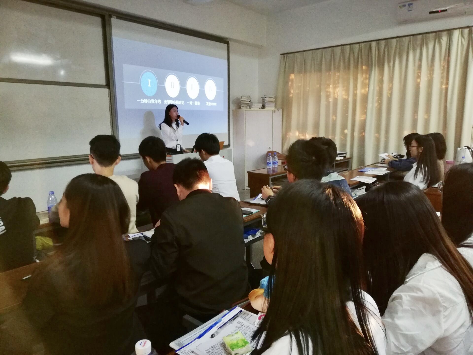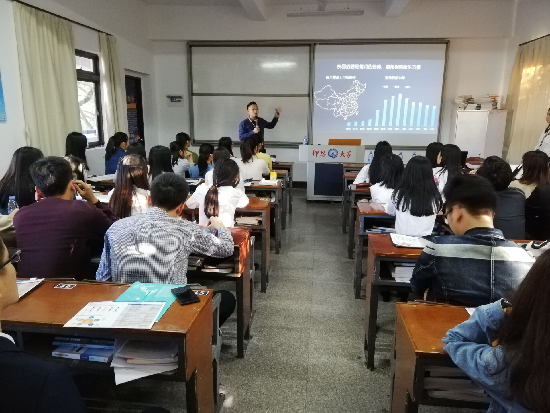 德邦快递相关负责人乐熔彬先生担任主讲,他以播放企业宣传片的形式在宏观上帮助毕业生了解德邦快递,并通过PPT详细介绍该公司的企业文化、组织结构、人才培养模式等。他希望应届毕业生在校期间学好专业知识的同时,也要多增加社会实践经验,提高综合素质。物流管理系大四毕业生都手持精心准备好的就业推荐表和个人简历,通过一分钟自我介绍进行初次筛选,再通过无领导小组讨论甄选,最后一对一单面。2015级物流管理专业学生因为专业知识扎实并且多次参加校外专业实践被企业相中。其他专业的同学则积极与招聘人员沟通交流,主动了解企业情况,招聘人员耐心地为同学们答疑解惑。