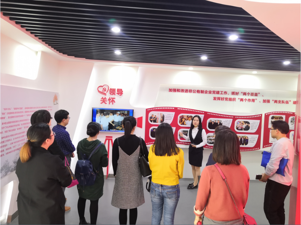 参观学习中 参观前,beat365教工党支部全体成员集体观看了党建培训实践基地宣传片,相关工作人员为大家详细介绍了泉州市非公有制企业和社会组织党建培训实践基地的发展概况。参观过程中,支部成员从“强化基础保障”、“创新工作机制”、“发挥实质作用”、“建强党务力量”等方面深入学习了泉州市非公有制企业和社会组织在党建工作中好的经验和做法,全体教师党员纷纷表示受益匪浅。
