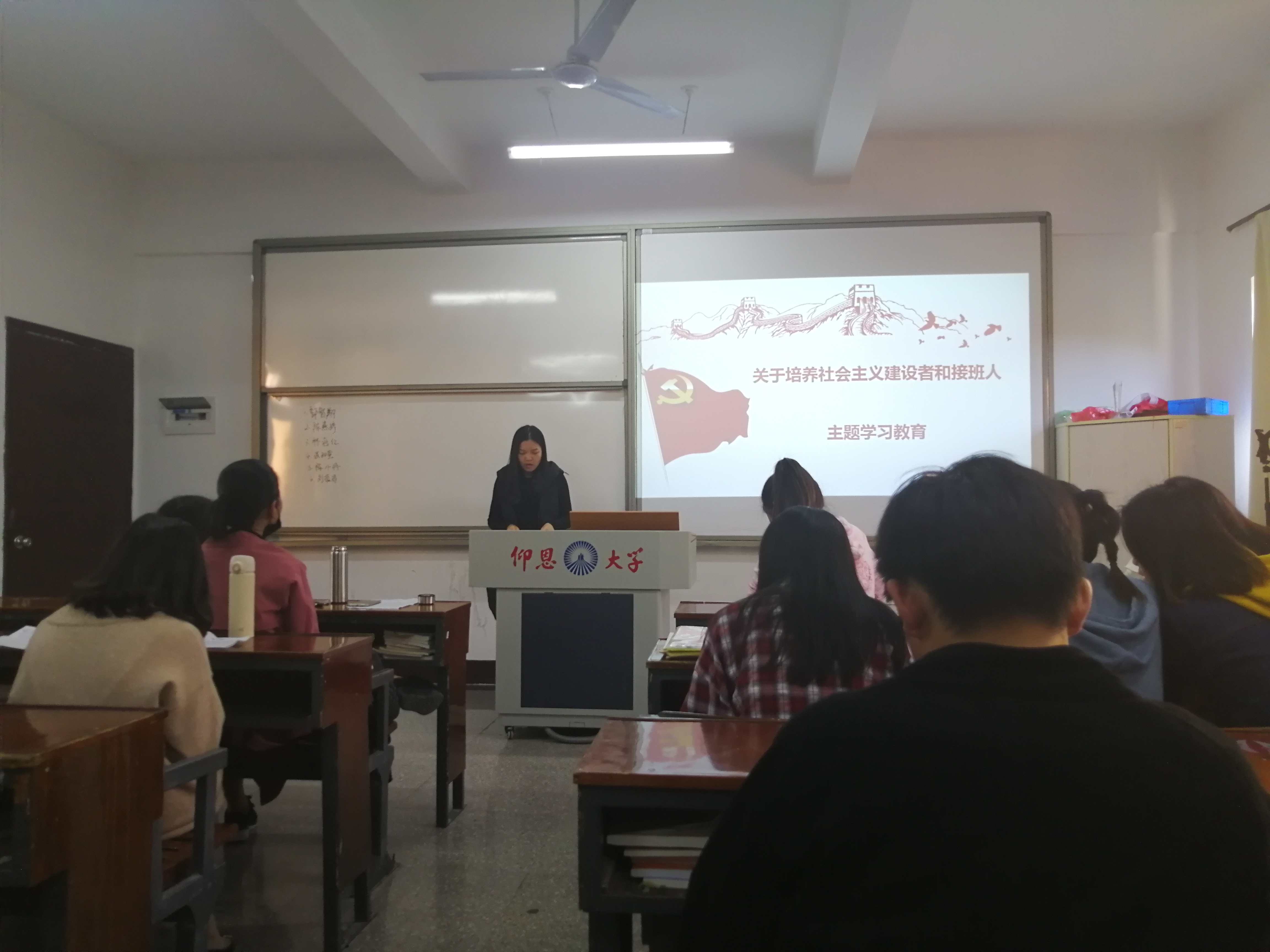 11月29日晚,市场营销系学生党支部在第一教学区共和楼411开展”培养社会主义建设者和接班人”主题学习教育活动。参加本次活动的有市场营销系学生党支部书记连景霞以及支部全体成员。