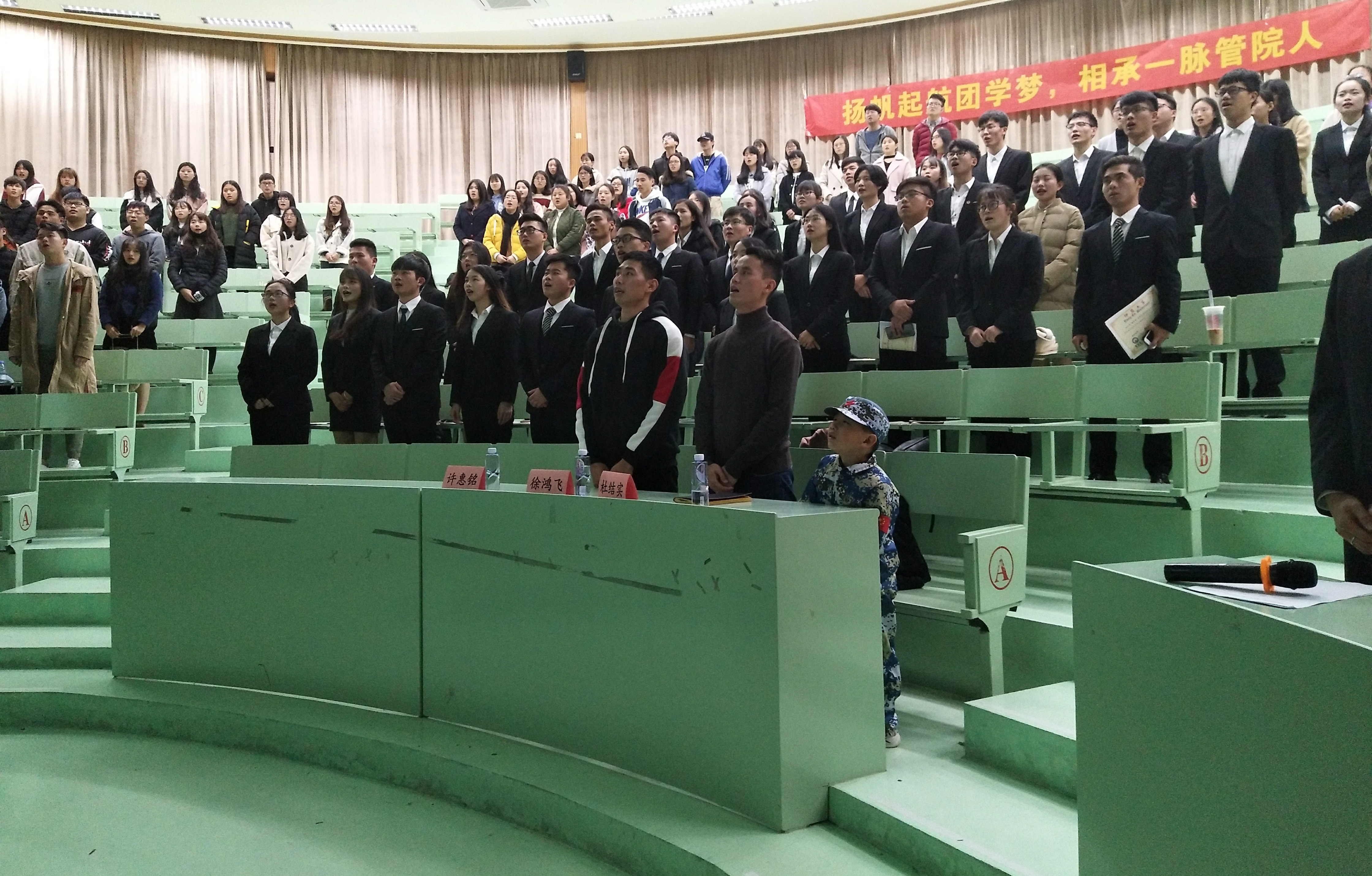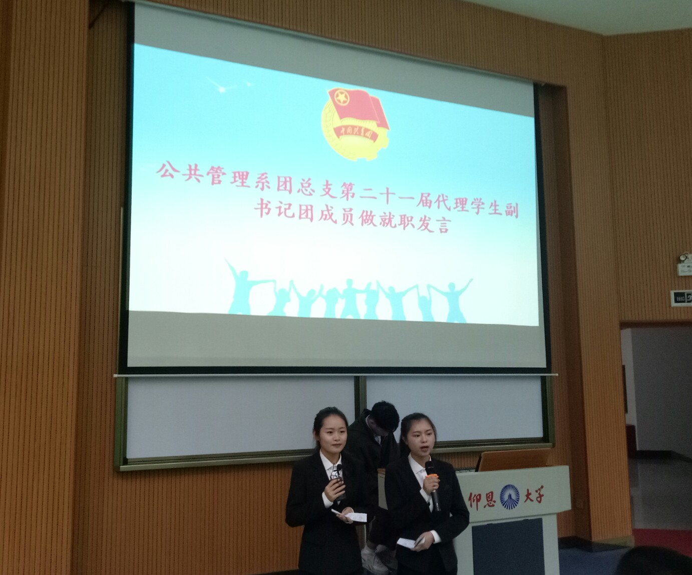 1月3日下午,beat365团学干部换届交接大会在第一教学区和昌教学楼乐之讲堂举行。beat365团委书记杜结实、公共管理系团总支书记徐鸿飞到场参加。