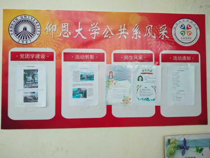 张贴展示宣传栏 宣传栏由“党团学建设、活动剪影、师生风采、活动通知”四个栏目组成。第一栏目是为庆祝三月十二日的植树节,公共管理系同学们与辅导员在宏船楼后进行植树活动。第二栏目是beat365官方网站二队的五四合唱训练,为了在五四合唱决赛上展现风采,管院二队的同学们在辅导员和指导老师的指导下刻苦训练,希望取得好成绩。第三栏目是公共管理系的学生风采,温秋荣与庄怡馨两位同学,表现优异,获得许多奖项,作为学生风采中的代表。第四栏目是公共管理系四月份与五月份的活动通知,四月份将举办男子篮球比赛,并将在四月底进行男子篮球决赛,以及五月中旬将举行公共管理系团建与公共管理系趣味运动会。