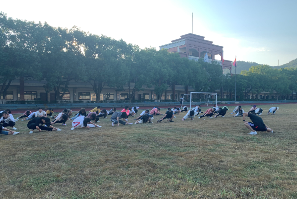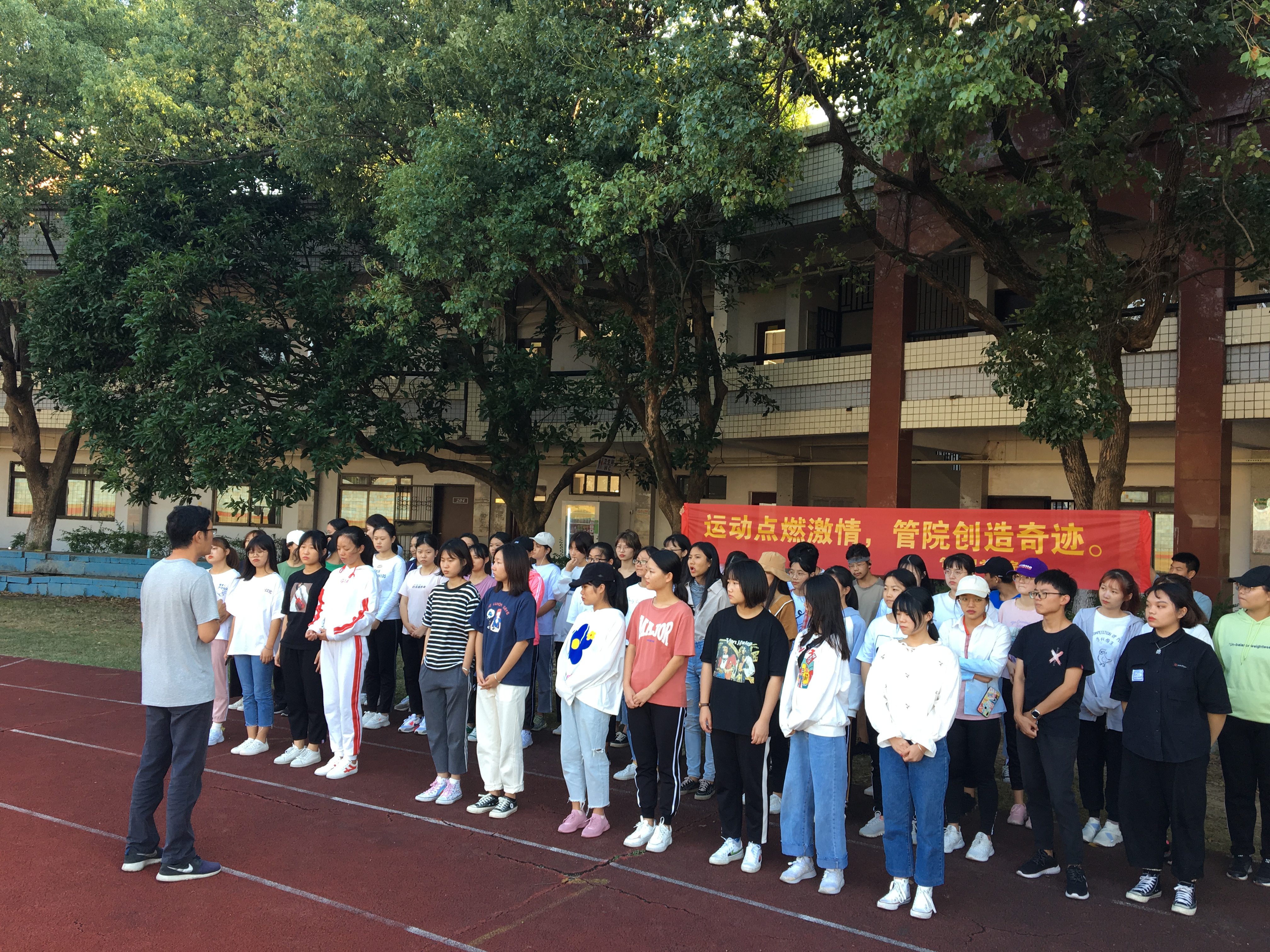 许惠铭作动员讲话 活动开始前,许惠铭作动员讲话,他指出,当前阶段大学生体育锻炼不足,体质严重下降,导致每学年的体质健康测试成绩不容乐观。学院发起“奔跑吧,少年”倡议,旨在提升同学们对体育运动的热情,强身健体,打破大部分班级学生体测恐慌的窘境。辅导员徐鸿飞与退役军人学生耐心指导同学们在操场上做跑圈、拉伸、立定跳远等热身运动,随后带领学生进行长跑活动。以轻松愉快的方式开展体育锻炼,多方面锻炼同学们的体能,激发了管院学子对体育运动的激情。