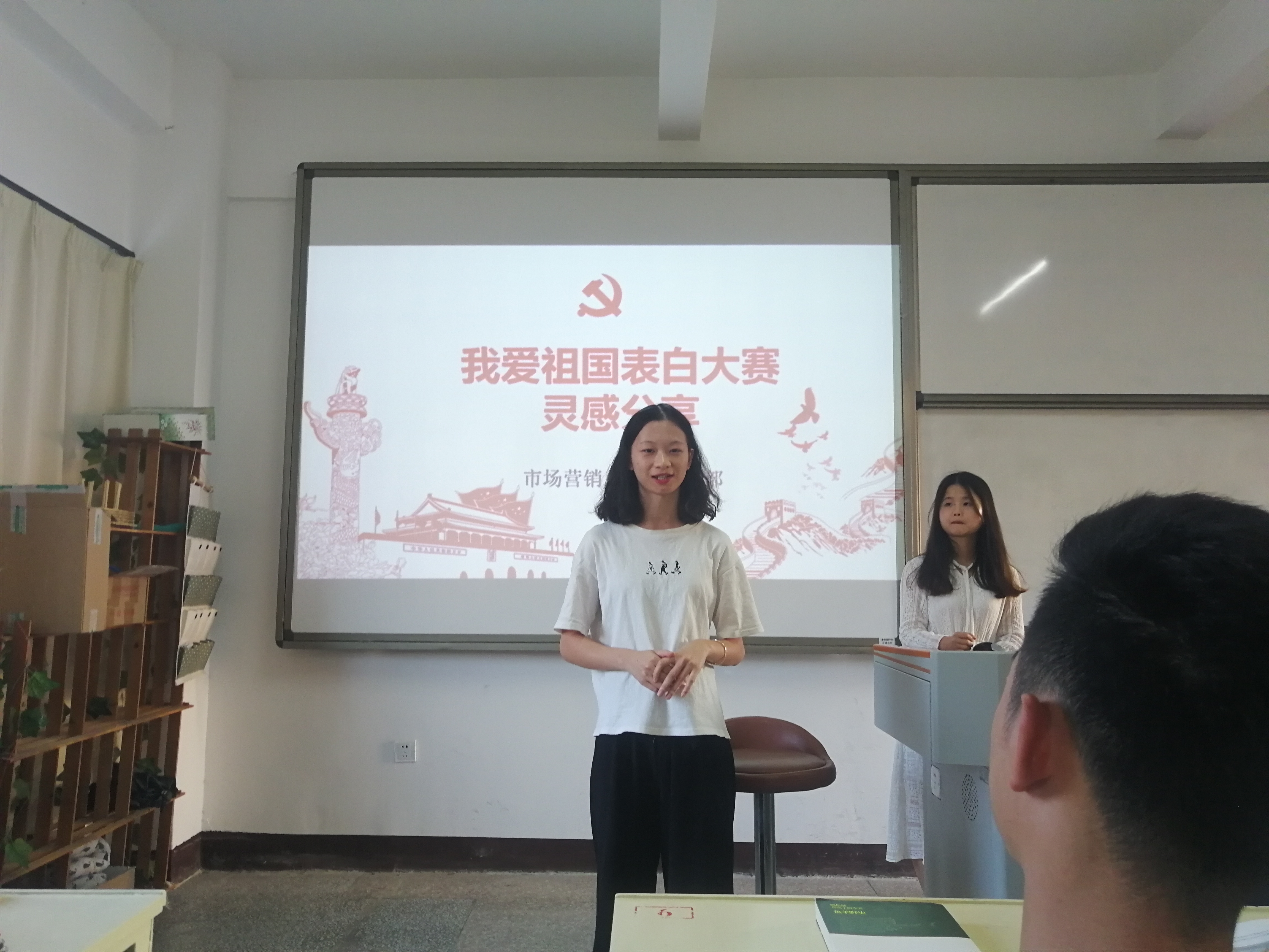 10月18日下午,市场营销系学生党支部在旧区吉龙楼304召开“我爱祖国表白大赛”总结大会。参加本次大会的有连景霞老师以及市场营销系学生党支部全体党员。会议由洪如莹同志主持。