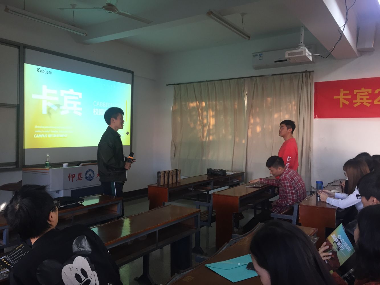 杨丽娟宣讲 此次宣讲会邀请了卡宾分公司乐宾副总杨丽娟和卡宾分公司培训师江帆到现场进行宣讲招聘。会上,江帆从卡宾服饰的简介、福利及招聘岗位展开介绍,并与到场的应届毕业生进行互动,杨经理则分享了自身的工作经历与感慨。最后,同学们积极参与,杨经理和培训师江帆耐心解答同学们的提问,现场氛围活跃。