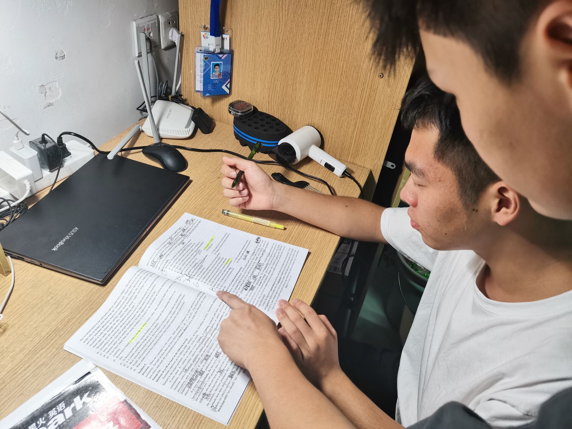 许林特 廖轶男 计划伊始,帮扶小组根据双方的学习习惯和学习方法,制定了符合两人第一阶段的学习方案。在学习过程中,帮扶同学互相督促,坚持天天背单词,做四级题目,大声读英语课文,努力完成帮扶计划。