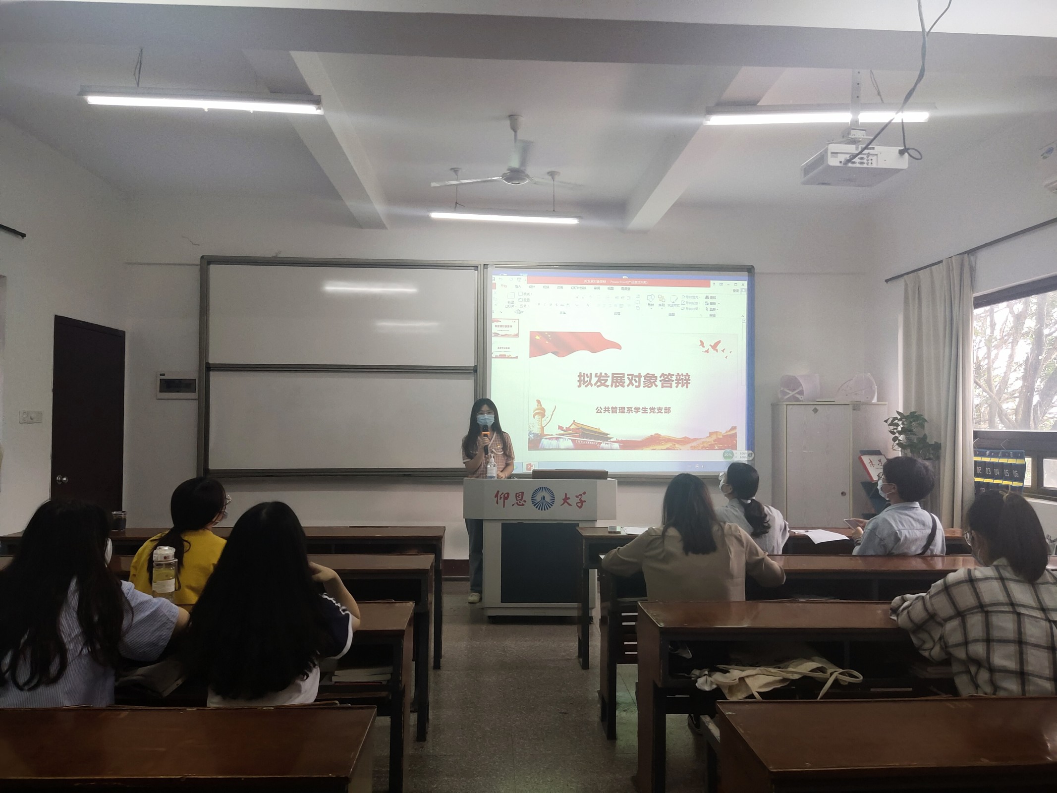 为了严格把控党员发展关,深入细致审查拟发展对象的入党动机、理论素养和政治觉悟等,保证党员发展质量,更好地发挥党员先锋模范作用,公共管理系学生党支部于4月28日在共和楼216教室开展“拟发展对象”答辩会。本次答辩会由公共管理系学生党支部书记叶丽香、beat365官方网站党总支宣传委员洪晓徽、支部支委及16名拟发展对象参加。