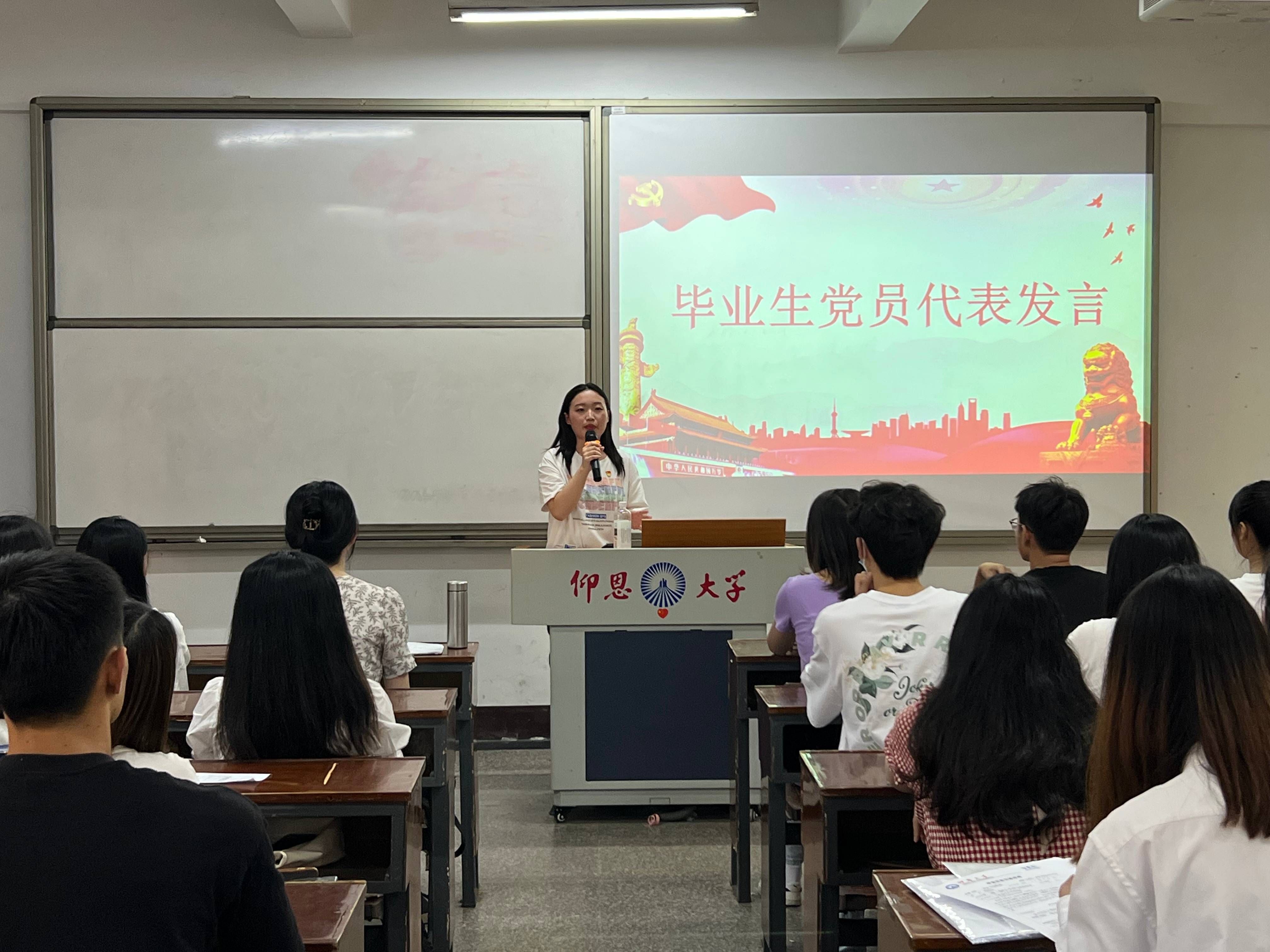 毕业生代表发言 首先,由林建泽同志带领全体党员重温入党誓词中拉开序幕,希望全体党员能够将入党誓词铭记于心。然后,由党支部书记连景霞老师为支部委员会成员颁发任职聘书。紧接着,毕业生党员代表王康宇同志、罗秀萍同志、黄柳桢同志依次上台发言,纷纷分享了自己的实习经验,建议学弟学妹们要在生活中、工作中磨练自我,并充分利用好在校时光,为将来寻找工作奠定基础。最后,由支部书记连景霞老师进行发言总结,嘱咐同学们要在未来的工作、生活中仍需继续加强理论知识的学习、铭记党员的身份、发挥先锋模范作用,同时也为毕业生党员送上了最真诚的祝福。