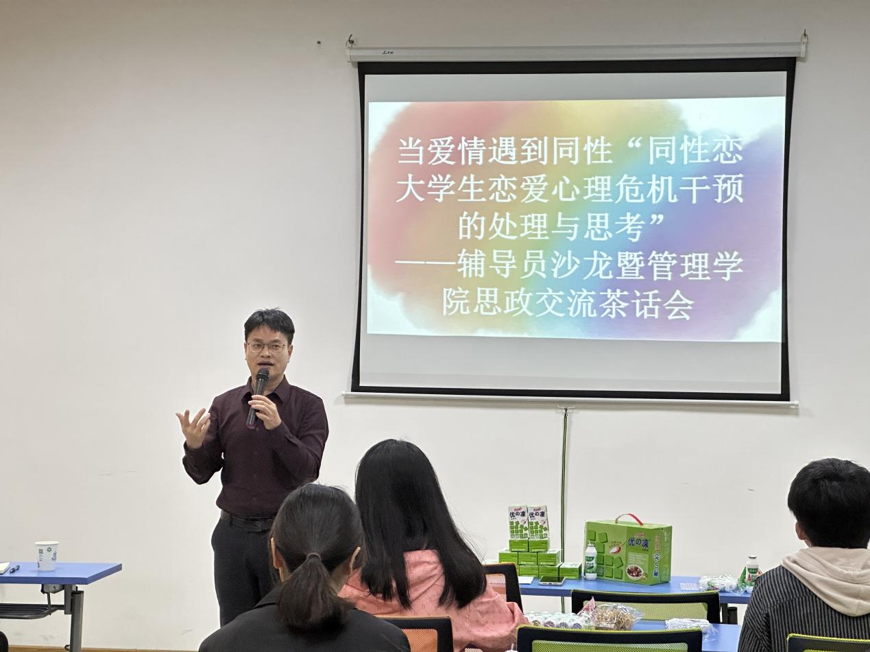 为提升beat365官方网站学工队伍的理论学习和案例实操能力。近日beat365官方网站在创业园培训中心召开主题为“当爱情遇到同性“同性恋大学生恋爱心理危机干预的处理与思考”的第一期思政交流茶话会活动。参与本次茶话会活动的有学事部主任吴胜潮老师,管理学院党总支书记兼常务副院长许惠铭老师,学事部姜兴华老师、心理中心王艳红老师及全体辅导员老师。