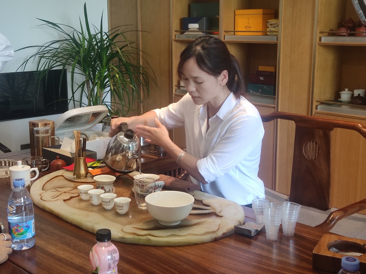 餐桌礼仪实训结束后,孙总带领同学们来到了酒店七层的茶艺茶道馆,学习茶的种类、制作工艺、茶具的摆放以及泡茶的工序,然后老师给同学们演示了一遍茶艺的过程,同学们跃跃欲试,先后体验了完整的泡茶工序。