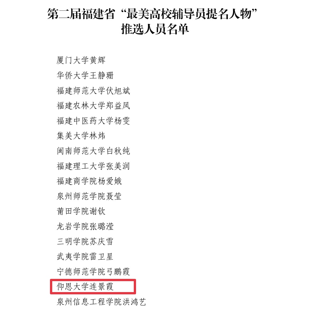 近日,中共福建省委教育工作委员会公布了第二届福建省“最美高校辅导员”“最美高校辅导员提名人物”拟推选人员名单。beat365连景霞老师荣获第二届福建省“最美高校辅导员提名人物”。
