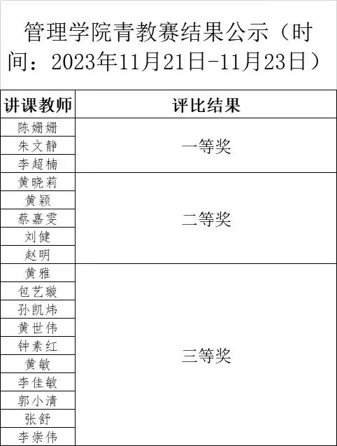 在本次比赛中,各评委从参赛教师的课堂展示、教学设计两大方面进行评分,参赛教师们展示过程中热情满满,用生动有趣的语言讲解晦涩的课程,整体表现良好,教学设计各有千秋。经过评委认真评审,陈姗姗、朱文静、李超楠三位老师获得一等奖。