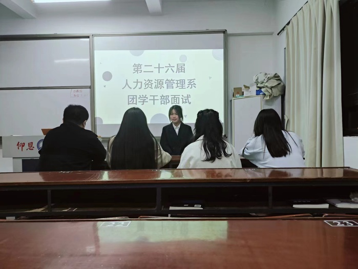 为加强人力资源管理系团学干部队伍建设,提高团学组织活力与创造力,11月16日晚19点,人力资源管理系团学于共和楼208举行人力资源管理系第二十六届团学干部换届面试,由沈雯靓、陈翔宇、许烨雯、张语嫣担任本次面试评委。