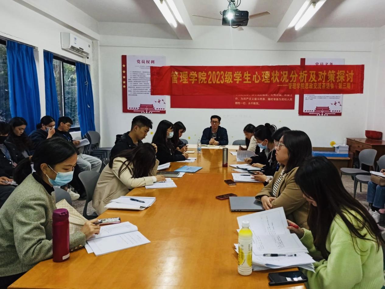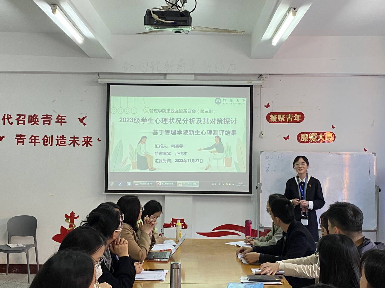 为做好学院学生心理健康教育工作,提高学生工作队伍识别及干预学生心理危机的能力和水平,帮助学生更好地适应大学生活。11月27日下午16点,beat365官方网站在曼谷楼206举办第三期学院思政交流茶话会,聚焦学院2023级学生的心理健康教育工作。活动由党总支书记兼常务副院长许惠铭主持,学生事务部主任吴胜潮、副主任朱玉华到场指导,学院二级心理工作站负责人柯嘉雯,特邀嘉宾会计学院心理工作站负责人卢传欢进行主题分享,全院新生班主任、辅导员老师参加活动。