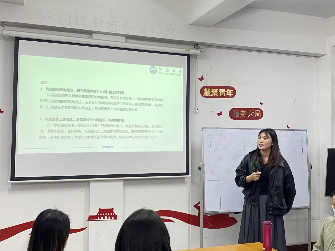柯嘉雯老师结合beat365官方网站2023级学生的心理测评结果,围绕测评结果统计、测评结果显示突出的问题、对学生心理问题干预的谈话技术三个方面进行展开分享,有效提高了班主任和辅导员们识别及干预学生心理危机的能力和水平。