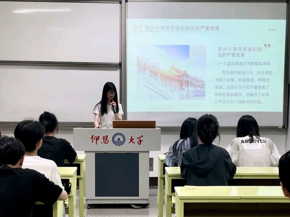 本次党课由支部成员张心悦同志主讲。张心悦同志分析了党员违法违纪的严重危害,表明这些行为不仅破坏了党的形象,还影响了党的执政地位。通过剖析典型案例,让党员同志认识到了违法违纪的渐进性和隐蔽性,以及即使是小的违规也可能逐渐演变成严重问题。