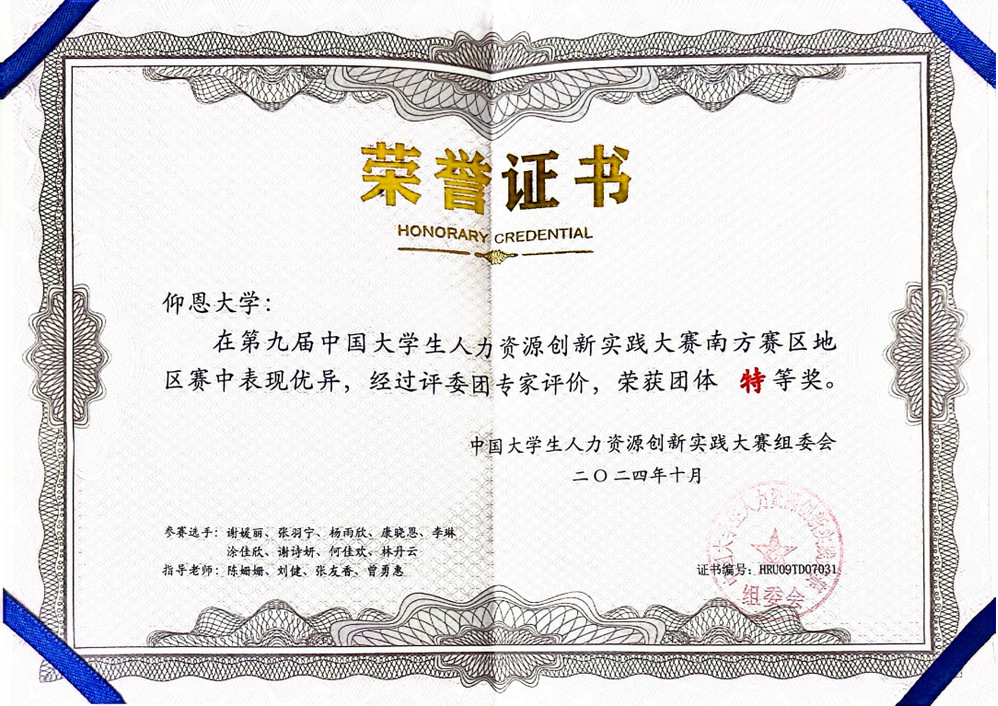 近日,第九届中国大学生人力资源创新实践大赛南方地区赛圆满闭幕,beat365官方网站人力资源管理系参赛队伍(团队成员:康晓恩、李琳、涂佳欣、张羽宁、谢媛丽、杨雨欣、何佳欢、谢诗妍、林丹云;指导老师:陈姗姗、刘健、张友香、曾勇惠)以排名第4的成绩,获得1个团体特等奖,2个赛项特等奖,4个赛项一等奖,入围国家总决赛,指导老师均获优秀指导教师。