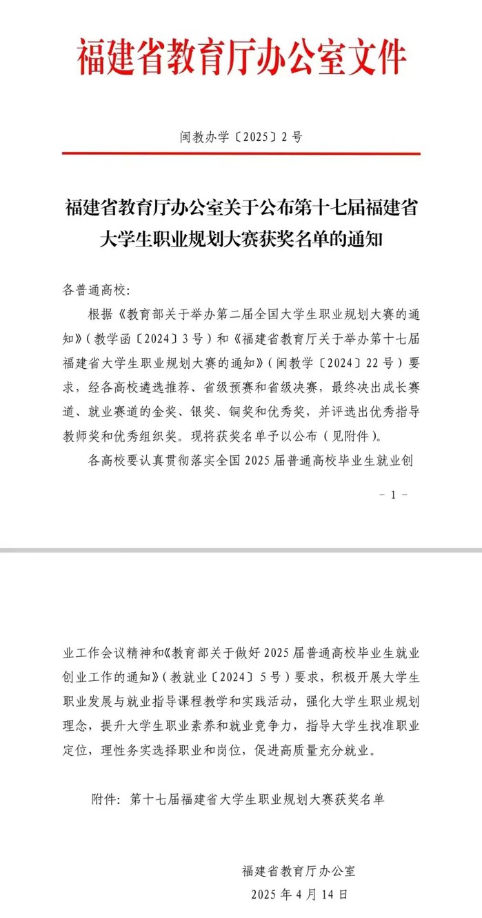 日前,福建省教育厅公布第十七届福建省大学生职业规划获奖名单,我院学子范灵璇在比赛中脱颖而出,荣获成长赛道高教组铜奖。