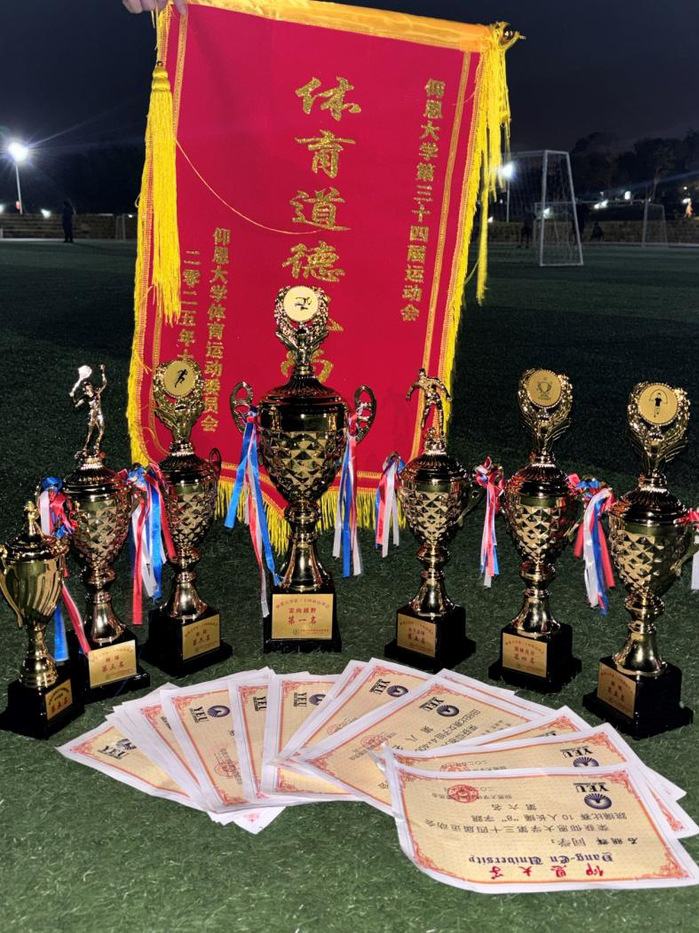 田赛赛场同样精彩。风拂过绿茵,吹动健儿发丝,他们心中唯有“为荣誉而战”的信念。沙坑中沙粒翻滚,缓冲垫上身影跃动,选手们拼尽全力挑战自我:刘炜获男子跳远季军,张文拿下男子跳高第五名、标枪第七名,韩哲获男子三级跳远第八名;叶鑫瑶获女子跳高第六名,丘烨华获女子标枪第六名,每一处赛场都留下他们全力以赴的身影。团队项目中,定向越野一举夺魁,展现了团队精准的策略与高效配合;网球项目斩获季军,队员们每一次挥拍都凝聚着必胜决心,奖牌成为他们实力与默契的最佳见证。