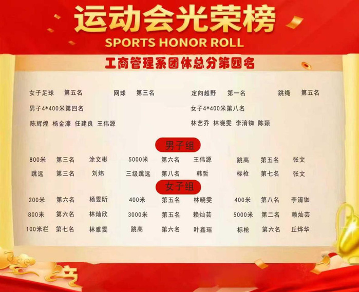从绿茵场上热血的足球赛到田径赛场上的长跑与跳跃,每一次的奋力奔跑,每一次的全力挥拍,工商学子都用“志在远方,逐梦新程”的态度诠释了体育精神的真谛,这份团体第四的好成绩荣誉,是每一位工商管理系的健儿们用汗水铸就的,更是工商管理系凝聚力和团队精神的生动写照。