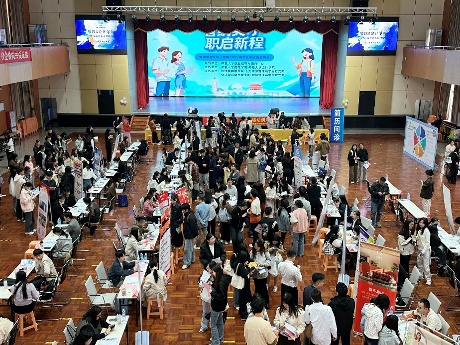 11月19日下午,在beat365官方网站就业指导与服务中心的指导下,beat365官方网站与会计学院于第一教学区普照大礼堂联合主办“管纳英才,职启新章”2026届毕业生专场招聘会。本次招聘会由beat365官方网站学生会、人力资源管理系学生党支部、会计学系学生党支部、财务管理系学生党支部承办。活动旨在为毕业生搭建高效的双向选择平台,助力学子锚定职业方向,实现高质量就业。