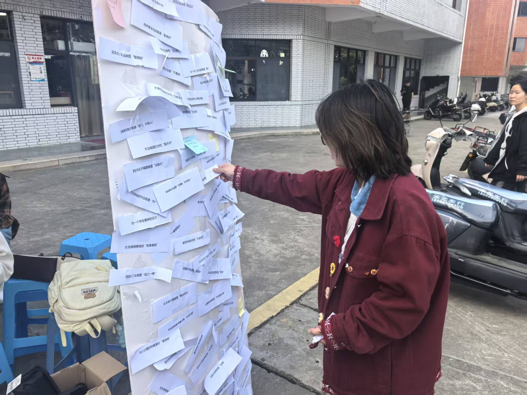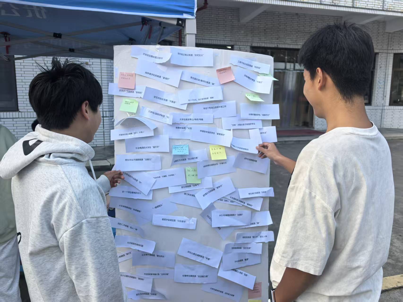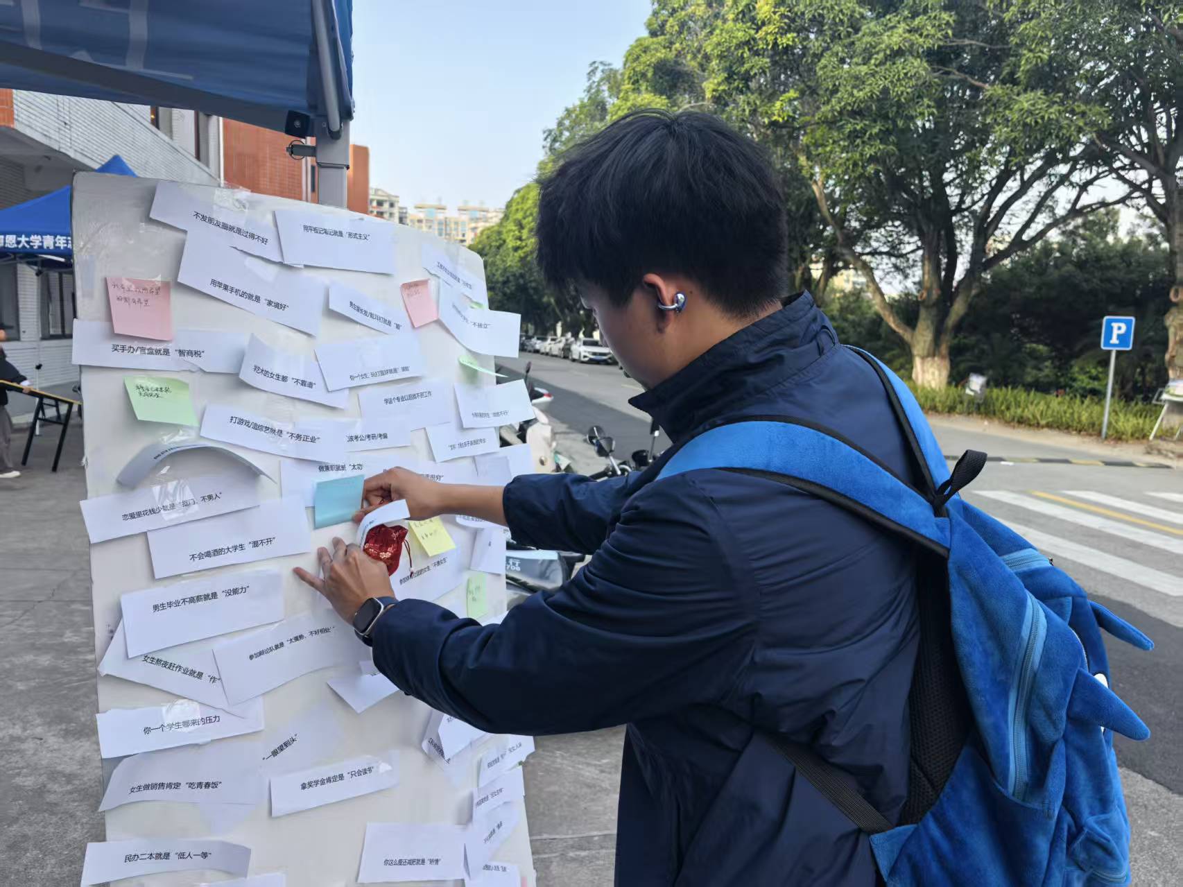 活动现场设置了贴满“负面标签”的展板,参与者首先从板上撕下自己反感的标签,随后用便利贴写下爱自己、爱生活的暖心语句,重新贴回展板。整个现场氛围松弛又温暖,随着一张张负面标签被撕下,正向话语陆续被贴上展板,同学们在简单的动作中完成了情绪的释放与自我的和解。