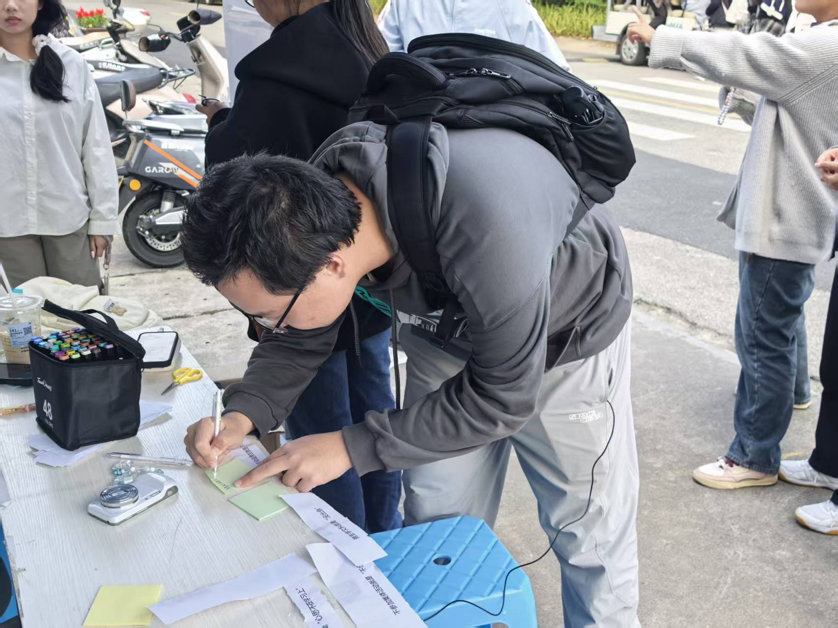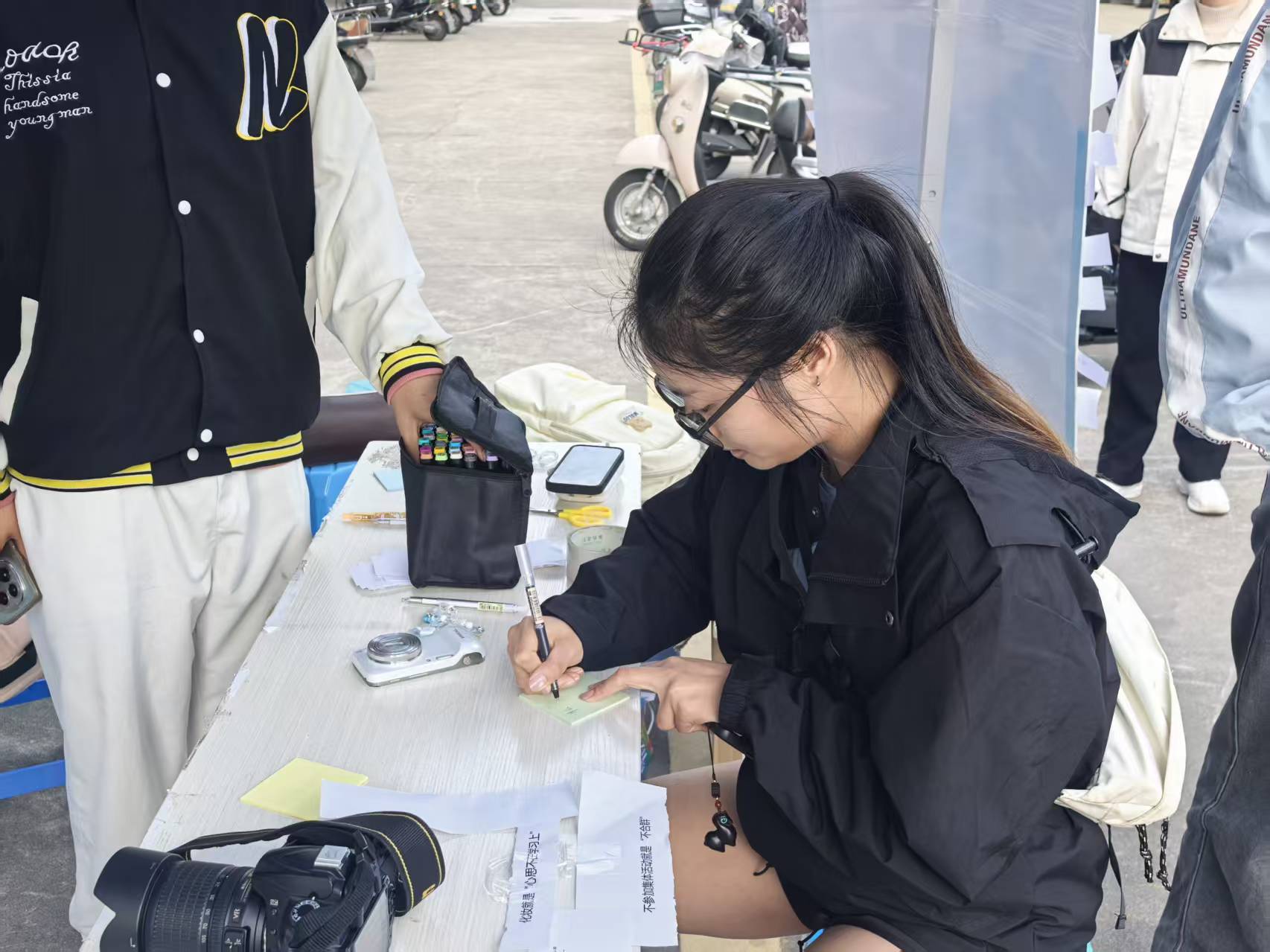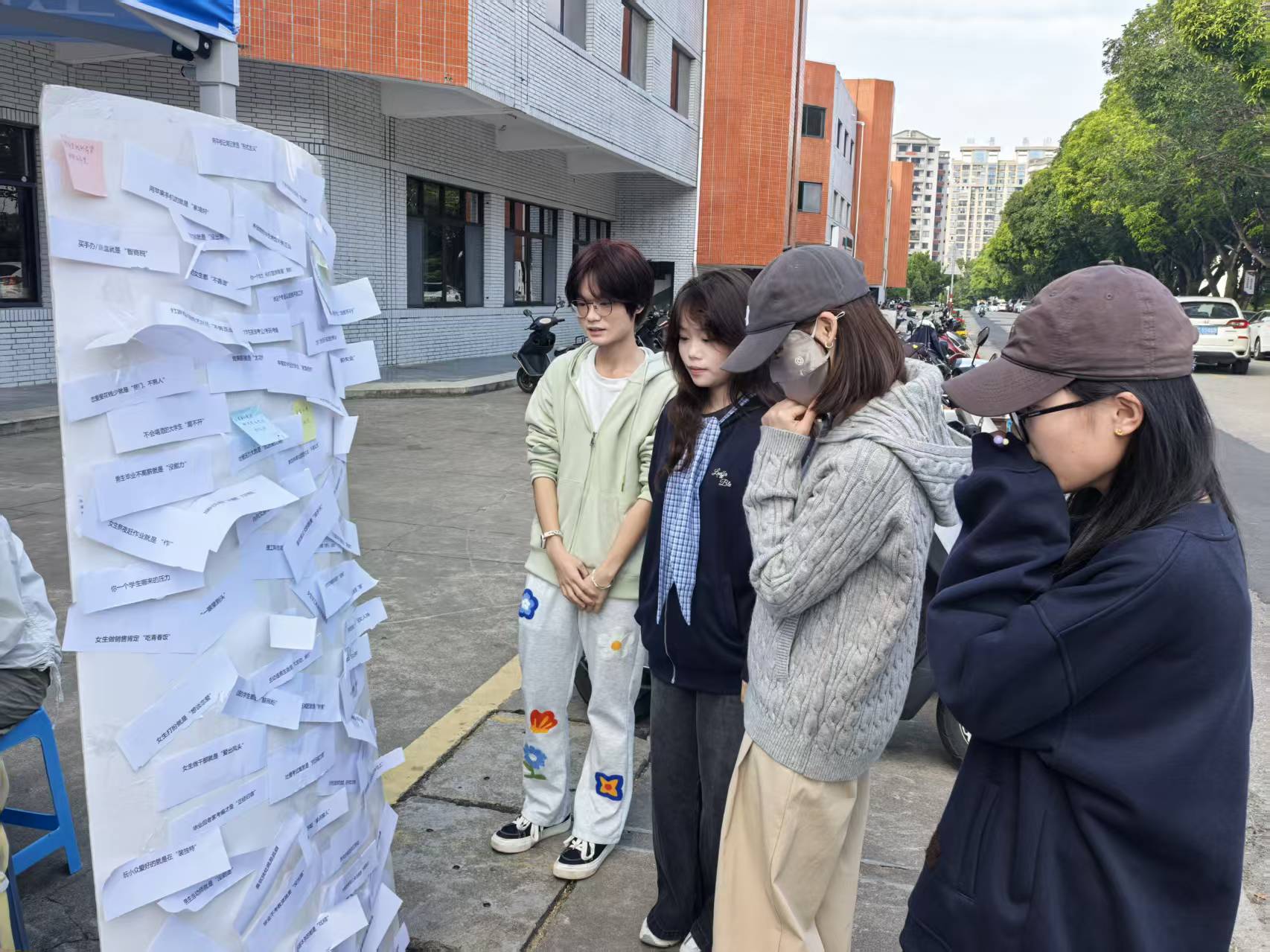 活动现场设置了贴满“负面标签”的展板,参与者首先从板上撕下自己反感的标签,随后用便利贴写下爱自己、爱生活的暖心语句,重新贴回展板。整个现场氛围松弛又温暖,随着一张张负面标签被撕下,正向话语陆续被贴上展板,同学们在简单的动作中完成了情绪的释放与自我的和解。