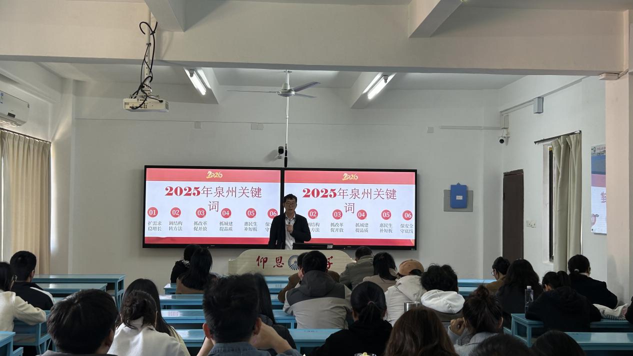 学院党总支书记兼常务副院长许惠铭对泉州市“两会”精神进行全面传达解读。他从扩需求稳增长、调结构转方式、抓改革促开放、抓城建提品质、惠民生补短板、保安全守底线六个维度,系统梳理了2025年泉州经济社会发展成就,结合地区生产总值增长5.3%、工业增加值增长6.3%等核心数据,展现了泉州实体经济根基夯实、开放格局持续拓展的良好态势。