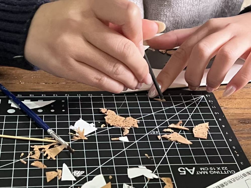 活动现场,软木画传承人先向队员们介绍了软木画的历史脉络与艺术价值,随后展示了从选材、切片到精雕、拼接的核心流程。一名队员主动尝试手工体验,在老师的悉心指导下,手持精细刀具,专注雕琢松树造型。软木材质轻薄脆弱,对力度把控和雕刻角度要求极高,队员反复调整手法,在一次次打磨中逐渐掌握技巧,最终完成了简易的松树雕刻作品,亲身领略“以刀代笔、以木为纸”的非遗妙趣。另一名队员则围绕活动主题,全程记录体验过程,并为后续访谈做好准备。