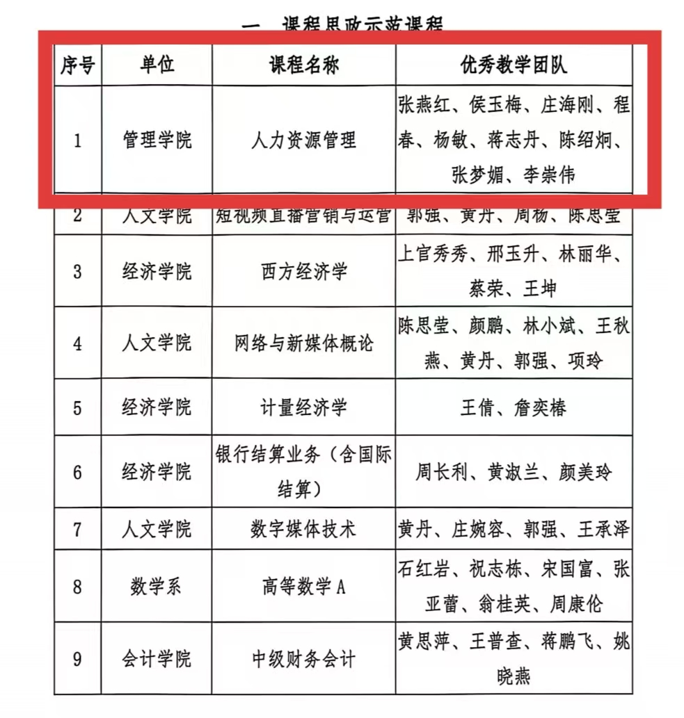 其中,《人力资源管理》课程成功获评校级“课程思政示范课程”,张燕红、侯玉梅、庄海刚、程春、杨敏、蒋志丹、陈绍炯、张梦媚、李崇伟组成的教学团队同步获评校级“课程思政优秀教学团队”。同时,学院教师在“课程思政示范课堂”评选中表现突出,赵明助教的《组织设计的“中国智慧”:以花江峡谷大桥为例》、陈姗姗讲师的《以匹配筑根基,以初心担使命——员工配置概述》、黄雅助教的《涵养未来引领者,领导力课堂的价值锚定与行动转化》三堂课堂成功入选校级“课程思政示范课堂”。