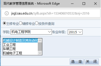 3弹出界面:学院-机电工程学院,专业年级-2015,下拉菜单—机械设计制造及其自动化,然后点击“选定”