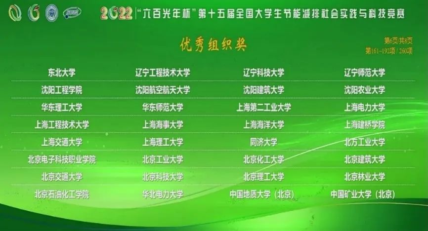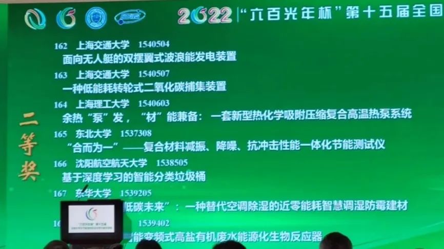 经专家评审会审议表决通过,共有1164件作品被评为第十五届全国大学生节能减排社会实践与科技竞赛三等奖,来自清华大学、天津大学、上海交通大学、浙江大学、重庆大学等全国114所高校的243件作品被推荐进入决赛。本届大赛共评选出特等奖10项(0.16%),一等奖138项(2.22%),二等奖227项(3.65%),三等奖1164项。