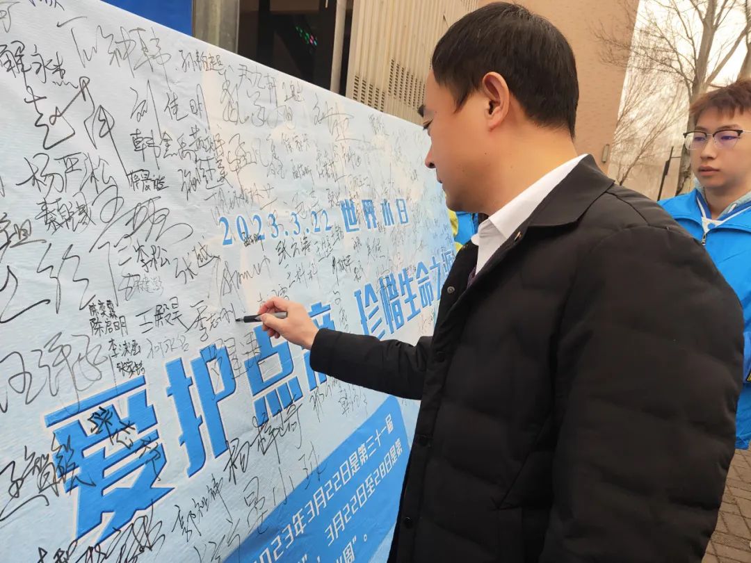3月22日中午,志愿者们于南区食堂楼下开展“世界水日”宣传志愿活动。在现场,他们为老师和同学讲解世界水日的由来与保护水源的重要性,并呼吁大家在活动展板上签名留念。志愿者为每个参与活动的师生系上象征水的丝带,让师生化身“节水使者”,带动身边人参与到世界水日中,号召更多的人用实际行动去节约用水、保护水资源。现场活动气氛热烈,来自各个学院的数百名师生参与活动。买球官方网站院长杨天华、党委书记季志刚等学院领导老师参与活动并带头签名。